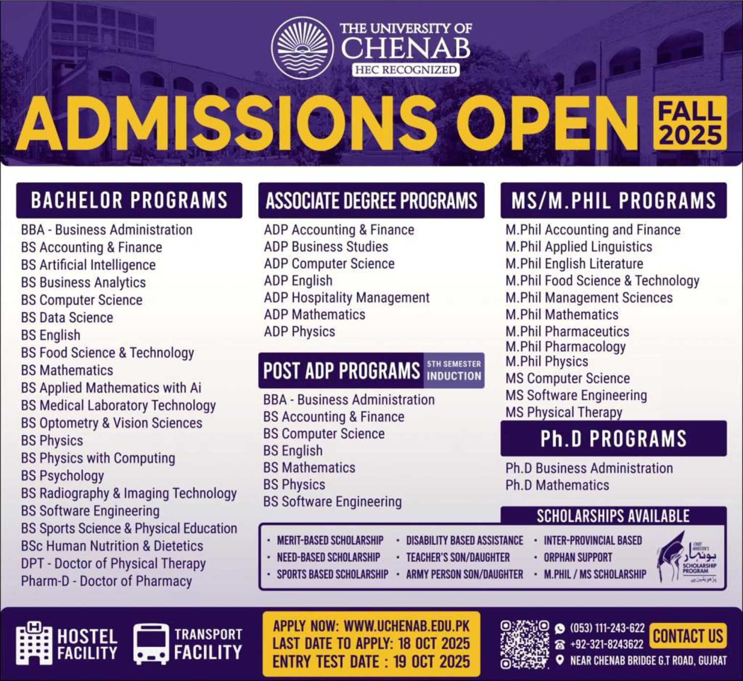 The University of Chenab, a fully HEC-recognized institution, has officially announced admissions for a wide range of programs for the academic session 2025. The university offers numerous undergraduate programs including BBA, BS in Accounting & Finance, Computer Science, Artificial Intelligence, Data Science, English, Food Science, Mathematics, Psychology, and many more. It also provides Associate Degree Programs, Post-ADP 5th Semester inductions, MS/M.Phil, and Ph.D. programs across multiple disciplines. The university supports students through various merit-based, need-based, sports-based, disability-based, and special scholarships, including facilities for teachers’ children, army personnel children, and orphan support. Additionally, students can benefit from hostel and transport facilities. Interested candidates must apply by 18 October 2025, and the entry test will be held on 19 October 2025. For more information, visit www.uchenab.edu.pk or contact 053-111-243-622 / +92-321-8243622. The university is conveniently located near Chenab Bridge, G.T. Road, Gujrat.